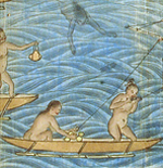 y sino con una paleta con que bogan estos navichuelos. Traen